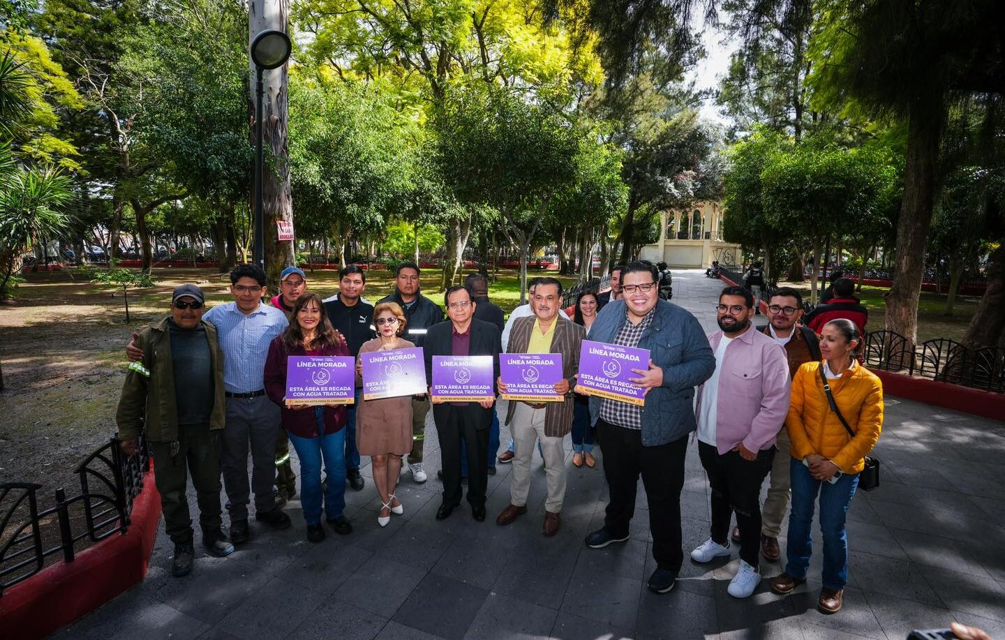 Celaya, Gto., a 16 de diciembre 2025.- Con la puesta en marcha del riego de áreas verdes de la Alameda Hidalgo con agua tratada de la línea morada, el municipio de Celaya ahorrará hasta mil 500 litros de agua potable mensuales para el mantenimiento del parque. Este sistema fue puesto en marcha este lunes.
