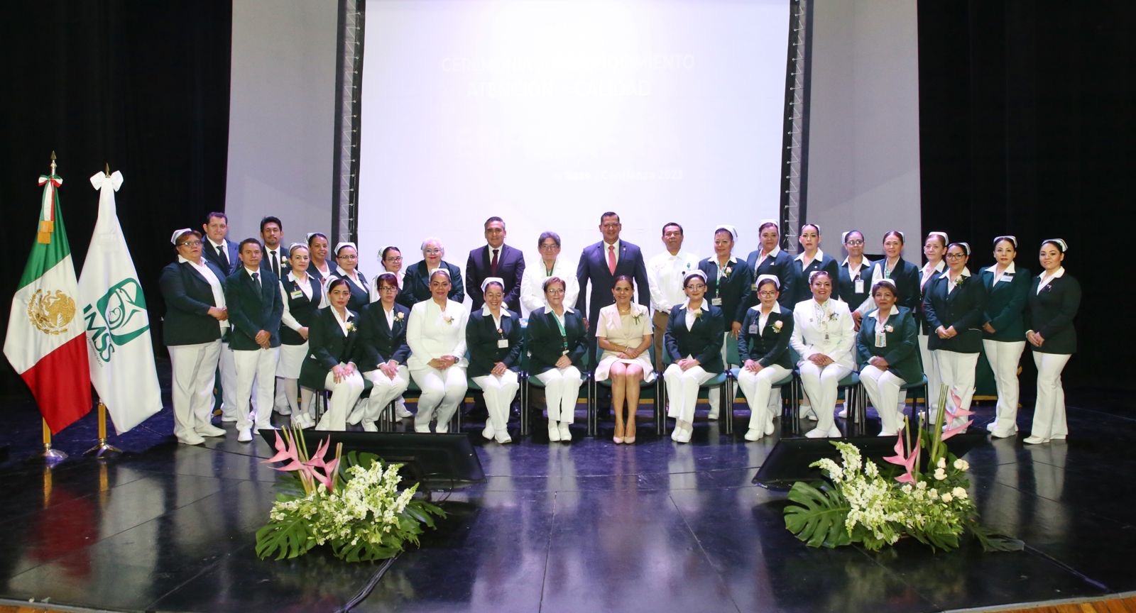 León, Gto.; a 14 de mayo de 2024.- Personal Institucional del Instituto Mexicano del Seguro Social (IMSS) en Guanajuato fue reconocido como la categoría más fuerte del Instituto en la “Ceremonia de Reconocimiento a la Atención de Calidad de Enfermería de Base y Confianza 2023”, en la cual destacaron 76 trabajadoras y trabajadores en las instalaciones del teatro Ignacio García Téllez, por su alto desempeño en el quehacer diario en beneficio de la derechohabiencia.