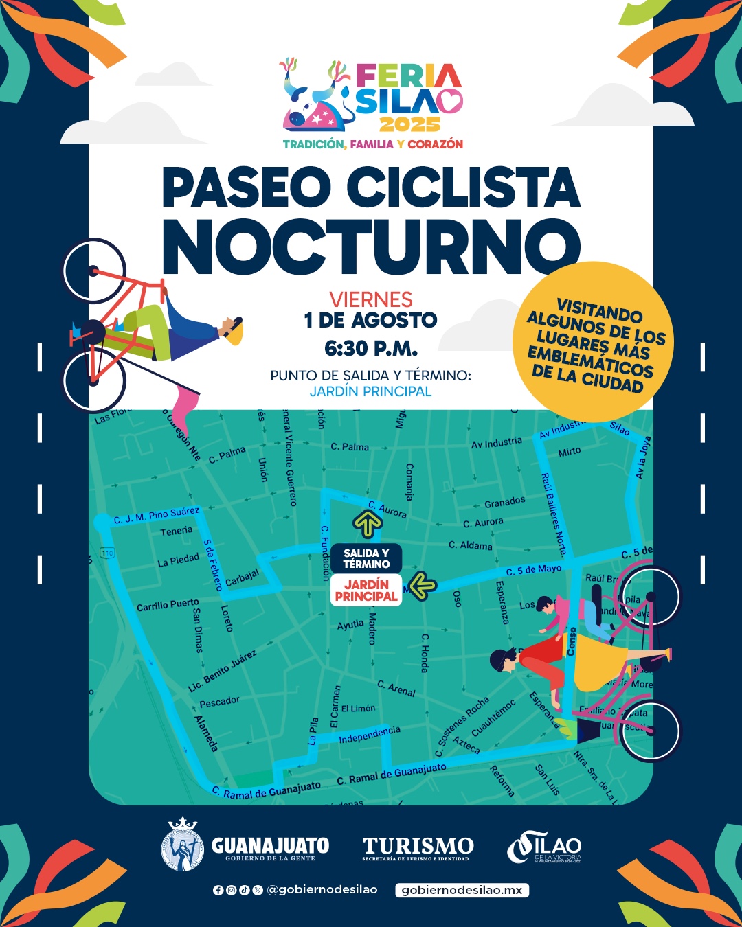 Silao, Gto. 01 agosto 2025.- Este 1° de agosto se realizará el paseo ciclista nocturno de Feria en Silao, en coordinación con la Comisión Municipal del Deporte y los clubes ‘Monitos de color’ y ‘Saetas’. La actividad está abierta al público y busca conectar a las y los participantes con la historia y el entorno urbano del centro de la ciudad.