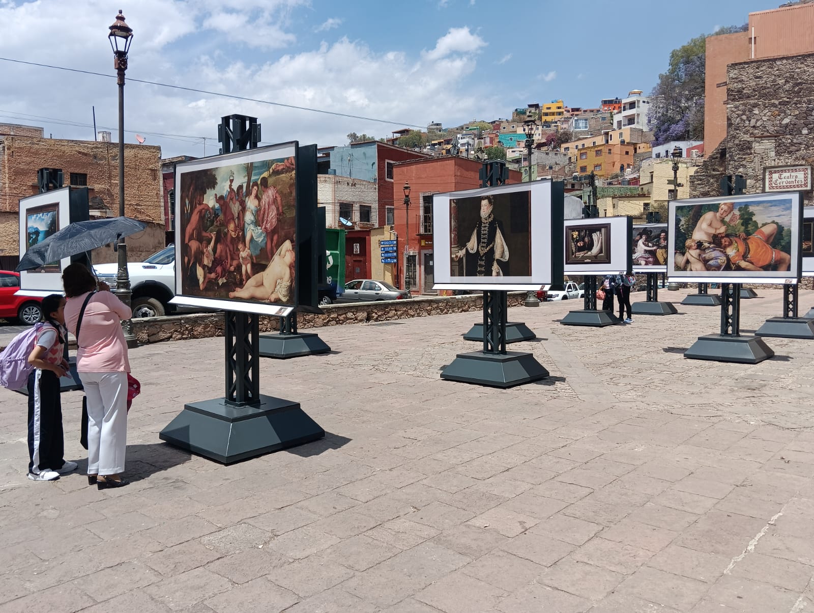 Guanajuato, Gto.; 15 de abril de 2024.- 56 reproducciones fotográficas de las obras maestras más famosas del Museo del Prado se exhiben en las plazas Allende y San Fernando de Guanajuato, la capital cervantina de América.