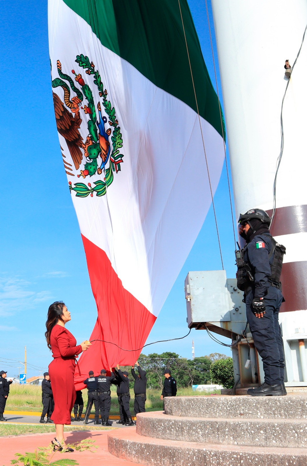 El acto cívico se conmemoró con un izamiento de bandera, encabezada por la presidenta municipal con participación de autoridades, estudiantes y ciudadanía.