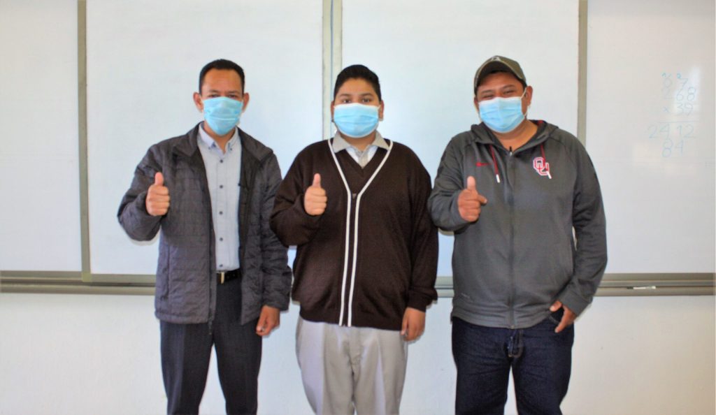 Junto a su maestro Oscar Elizarrarás Núñez y de su papá Saúl Lisaldo Granados Fonseca, Fernando Josué de 13 años, oriundo de los Ranchitos poblado cercano a Estación Joaquín, comentó que su amor por las matemáticas se lo contagio su papá Saúl, quien, ha sido un apoyo importante en su vida. Y por ello desde que cursaba primaria, dedica tiempo extra para la realización de operaciones.