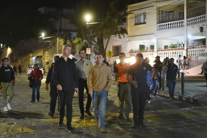 Junto con el secretario de Seguridad Ciudadana, Samuel Ugalde, y un grupo de elementos policiales, de Fiscalización y de Protección Civil, el Presidente Municipal recorrió la calle Alhóndiga, la plaza de Músico, el mercado Hidalgo, la avenida Juárez la plaza de los Ángeles, el callejón del Beso, San Fernando, la plaza Paz, el jardín Unión Sopeña y la calle Cantarranas, entre otros puntos del primer cuadro.