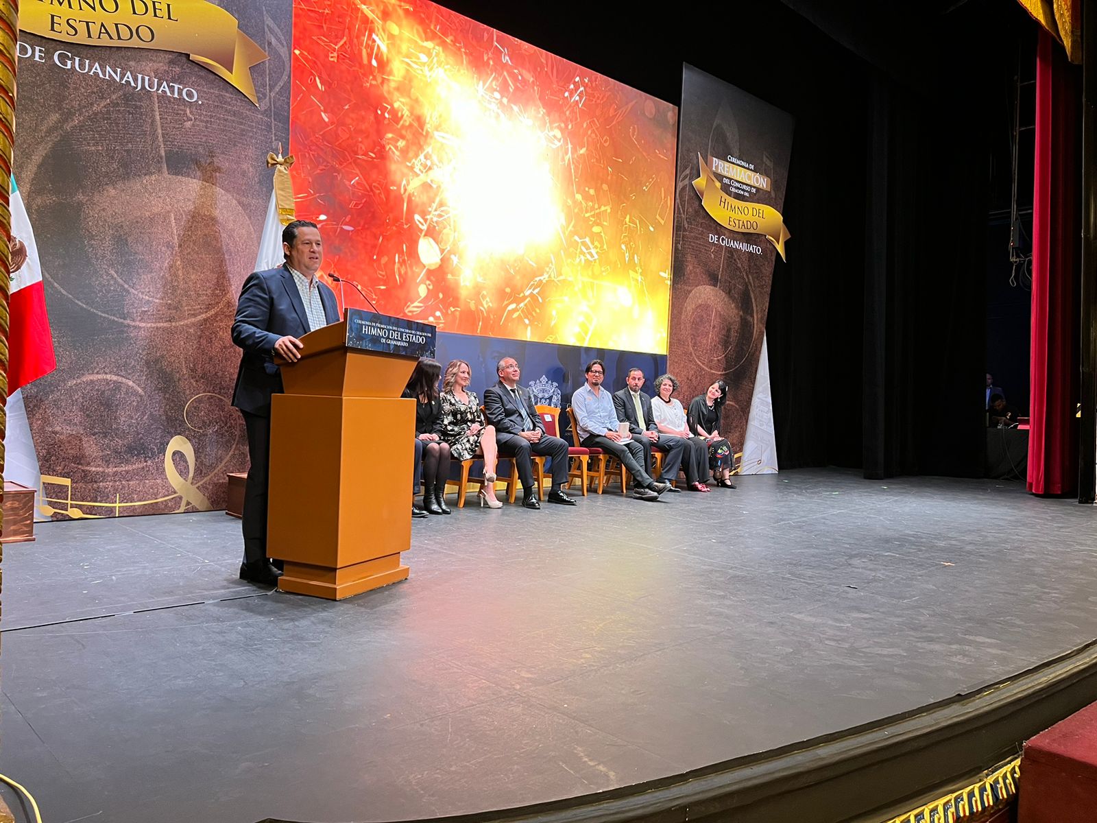 Fue en el teatro Juárez, en torno a la premiación al ganador de la convocatoria de composición del Himno de Guanajuato, que entre setenta y un aspirantes, el jurado calificador de expertos lo otorgó al leonés Eduardo Francisco Muñoz Ezquivel, a quien felicitó el gobernante estatal.