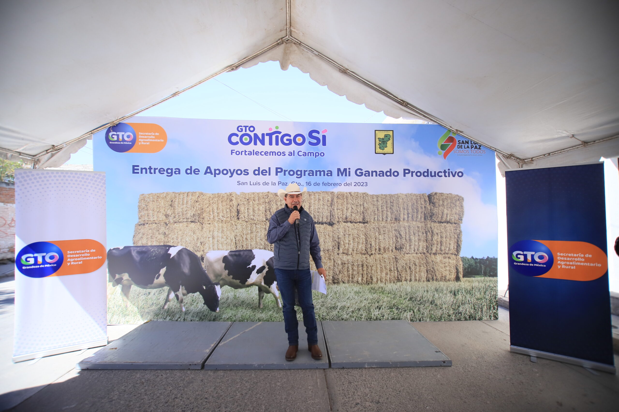 San Luis de la Paz, Gto. 17 de febrero del 2023.- Para fortalecer la actividad de los ganaderos, la Secretaría de Desarrollo Agroalimentario y Rural del Estado, en coordinación con la Asociación Ganadera Tierra y Libertad de San Luis de la Paz, entregó 100 apoyos ganaderos y 300 pacas de rastrojo para alimentar al ganado.