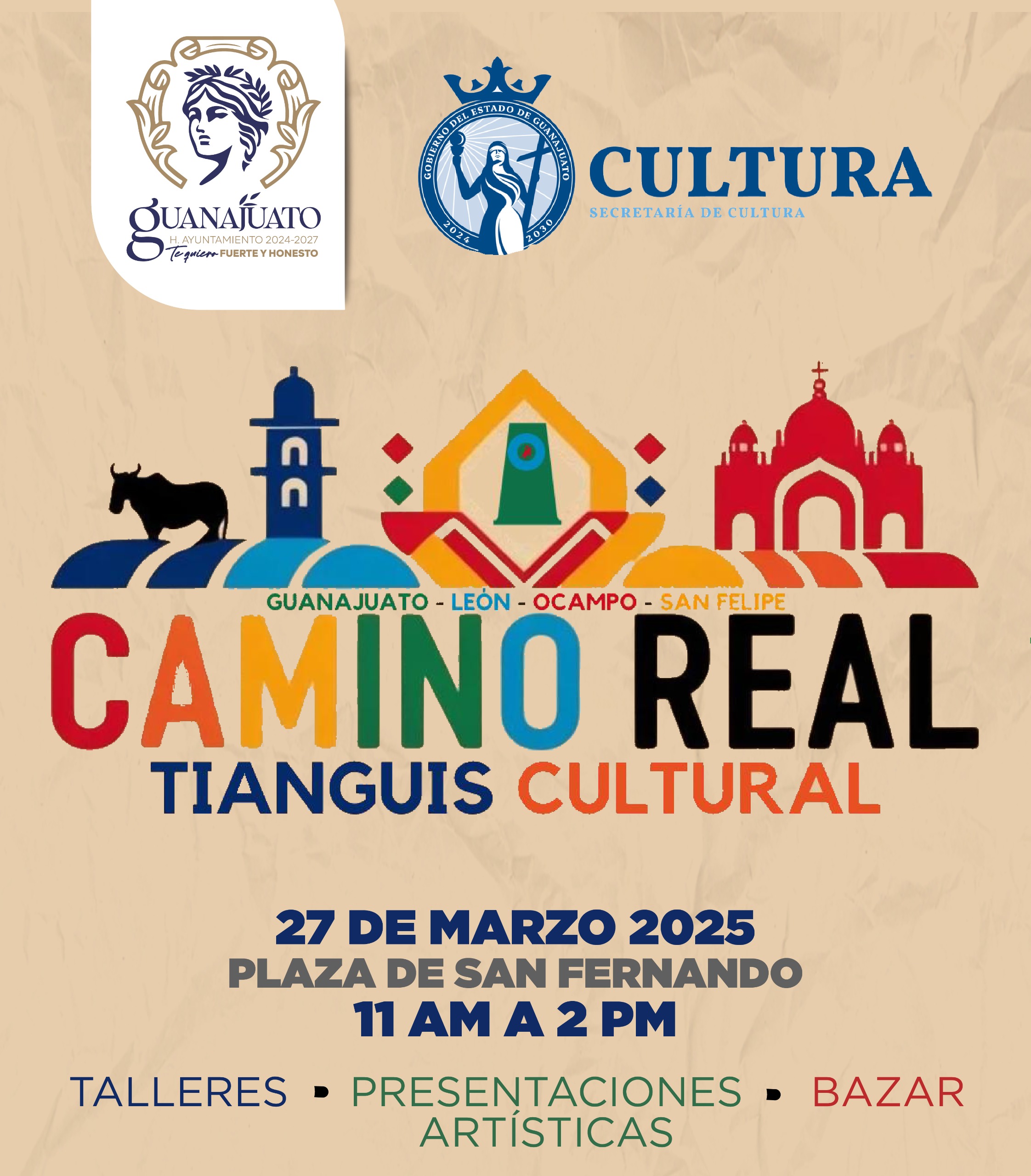 Guanajuato Capital será sede del Tianguis Cultural Camino Real el 27 de marzo, donde municipios como León, Ocampo, San Felipe y Guanajuato compartirán su riqueza cultural mediante talleres, espectáculos y exhibiciones de productos típicos.