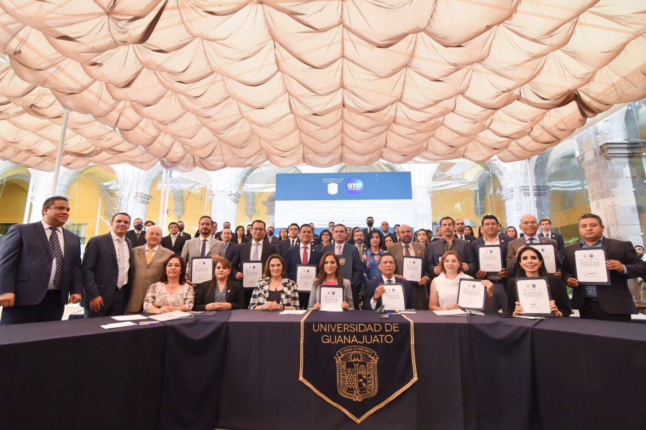En la firma del convenio participaron alcaldes y alcaldesas de los municipios en los que existen sedes de la Universidad de Guanajuato, tanto de nivel superior como medio superior, autoridades estatales y universitarias.