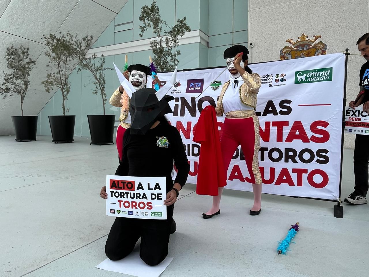 Activistas protestan en el Congreso de Guanajuato para exigir el fin de la violencia en las corridas de toros.