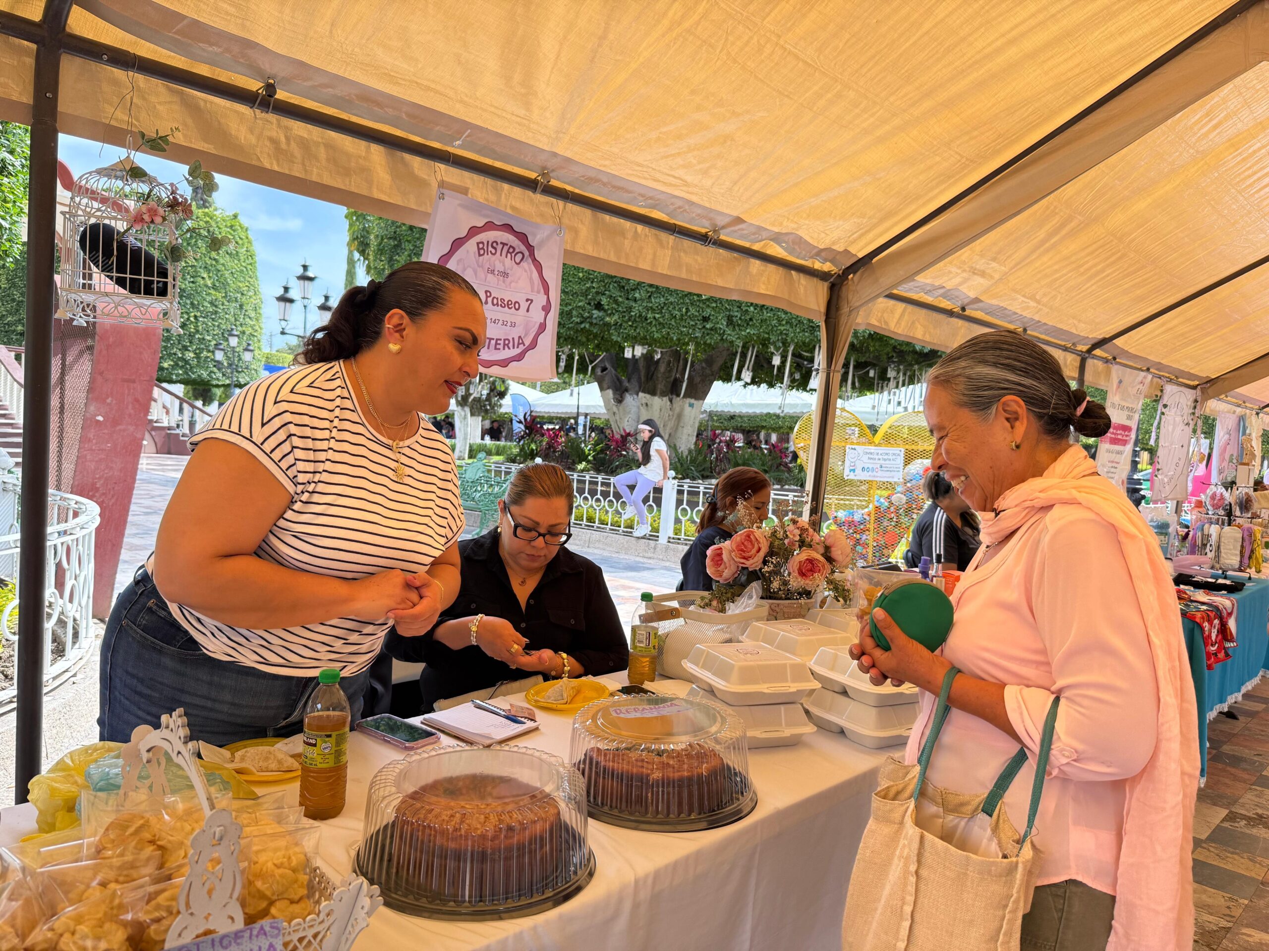 Más de 15 mujeres participaron en la Feria de Artesanas y Emprendedoras, donde expusieron y vendieron sus productos en el jardín principal.