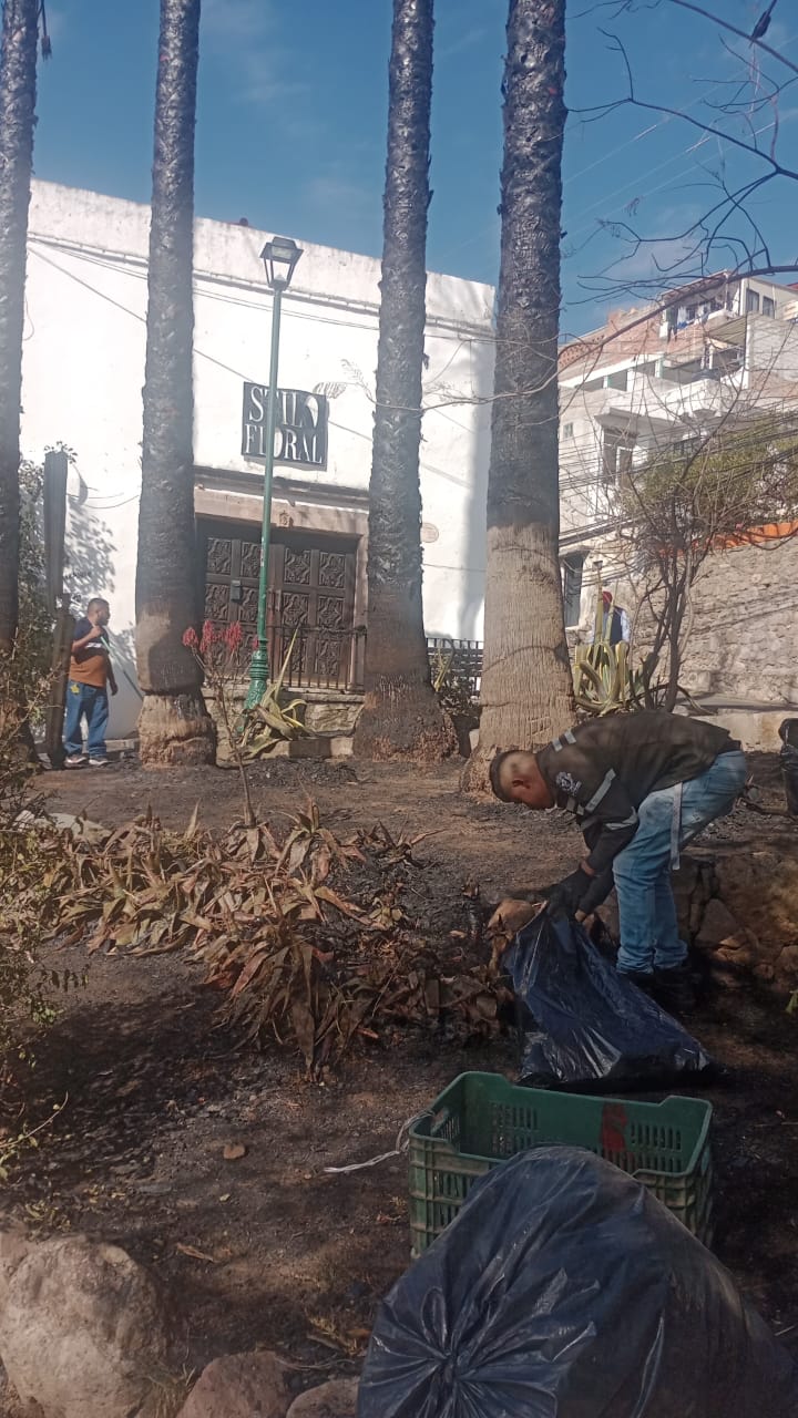 La Dirección General de Servicios Públicos de Guanajuato Capital inició labores para salvar las 10 palmeras quemadas la madrugada de este miércoles en la zona de San Javier.