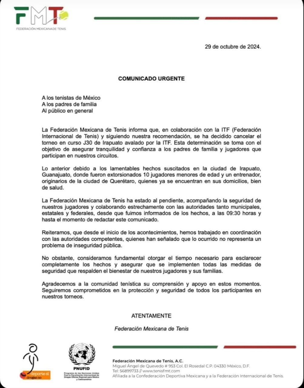 Federación Mexicana de Tenis cancela torneo Irapuato