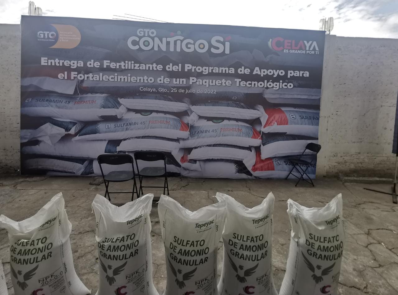 Como parte del Programa de Apoyo para el Fortalecimiento, en Tenería del Santuario se hizo entrega de 186 toneladas de fertilizante a 233 productores de 30 comunidades del municipio de Celaya.