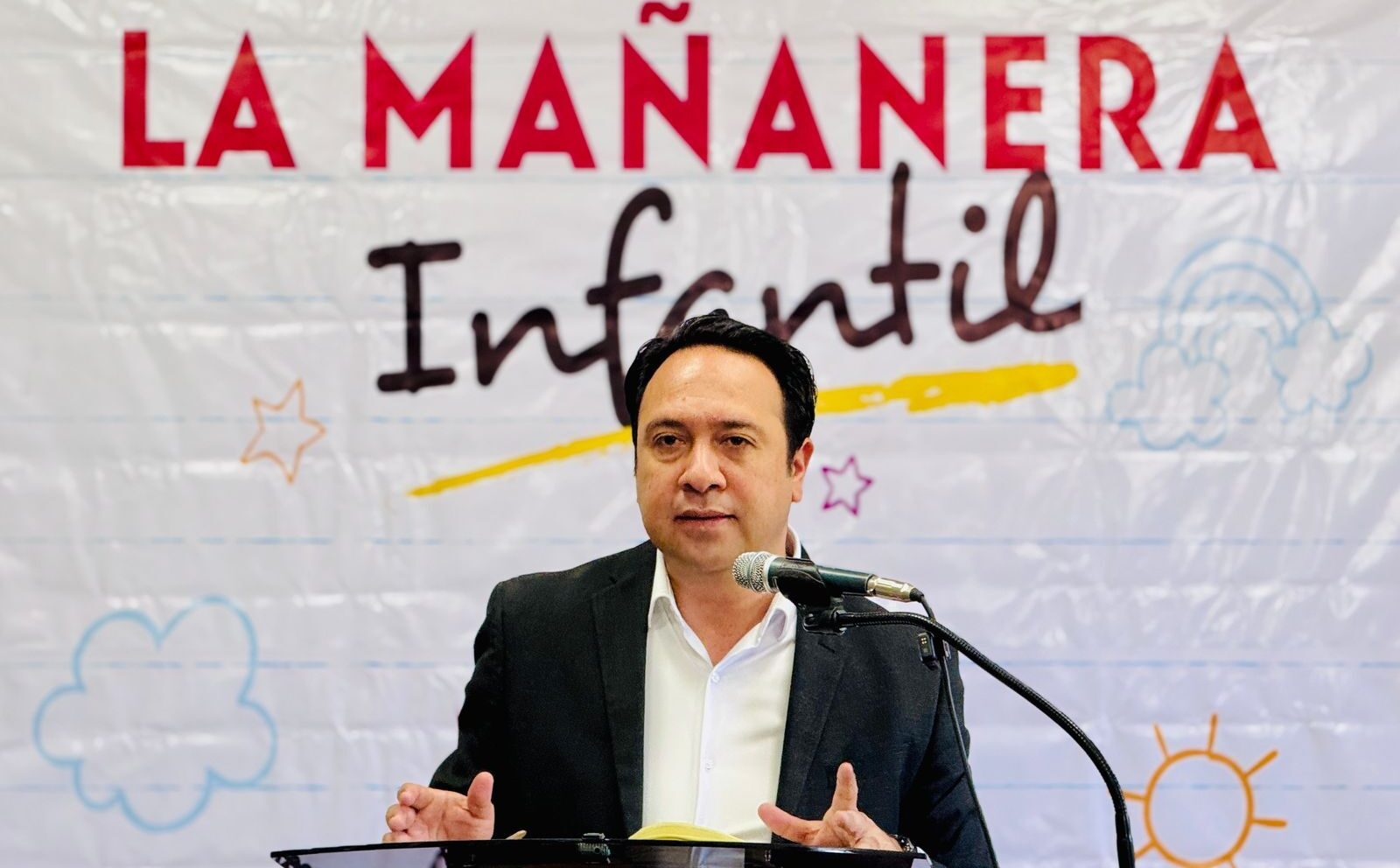 El Presidente Municipal interactúa en ronda de preguntas y respuestas con alumnos de nivel básico en la mañanera infantil