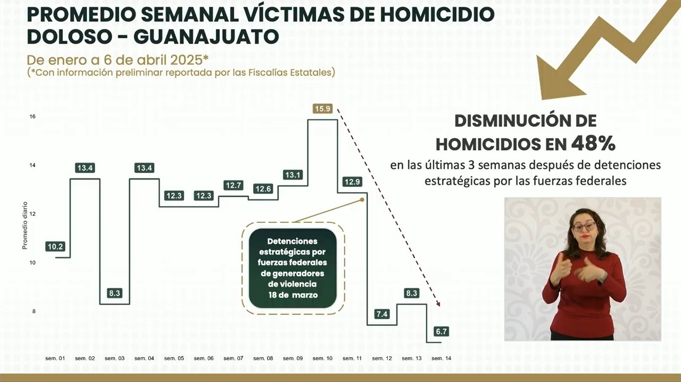 Homicidios dolosos en Guanajuato bajan 48% en tres semanas, según el Gobierno Federal, gracias a operativos y detención de líderes criminales.