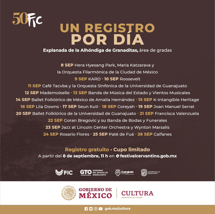 El registro iniciará a las 11 de la mañana del ocho de septiembre y el público interesado podrá ingresar a la página festivalcervantino.gob.mx,