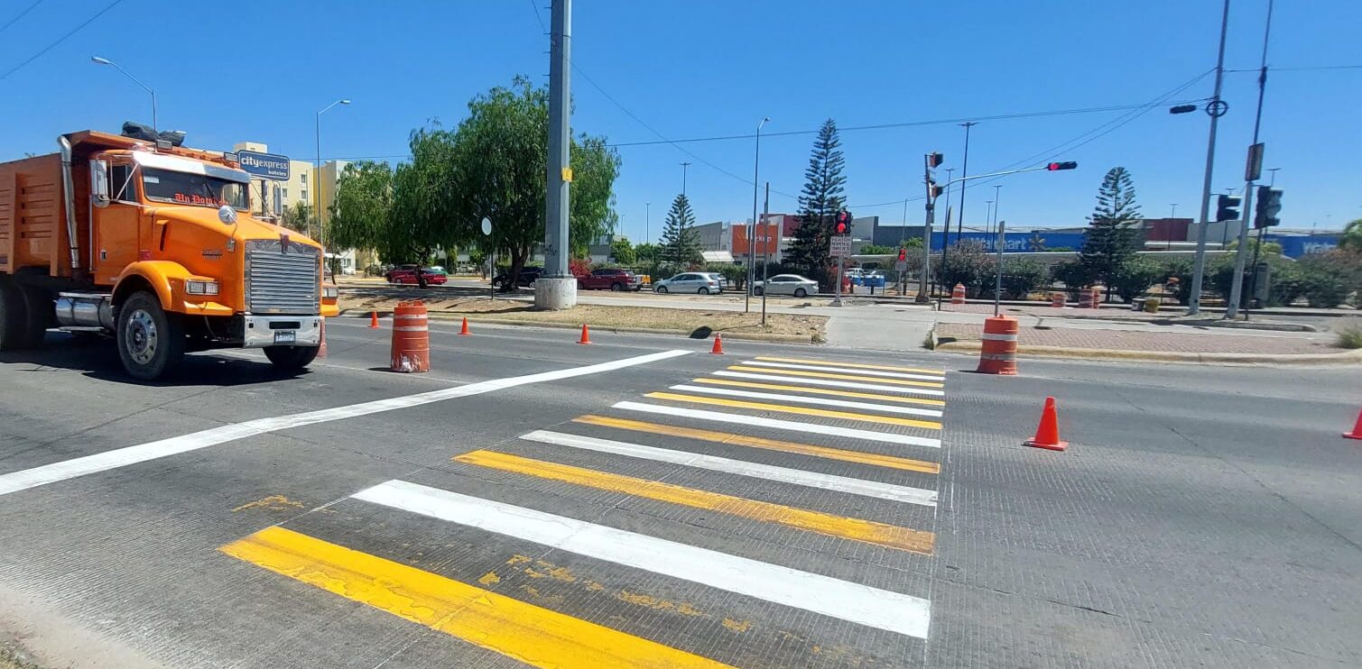 Realizan pruebas de pintura en cruces peatonales y carriles del Eje Manuel J. Clouthier esquina con Paseo de los Naranjos para garantizar calidad y durabilidad en la señalización vial.
