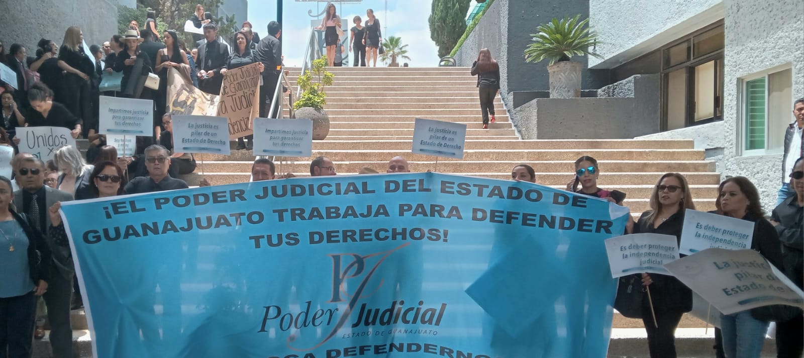 Trabajadores estatales la mayoría vestidos de negro, se manifestaron lo que denominaron sobre su posicionamiento del Poder Judicial del Estado de Guanajuato, de rechazo ante la reforma al Poder Judicial Federal.
