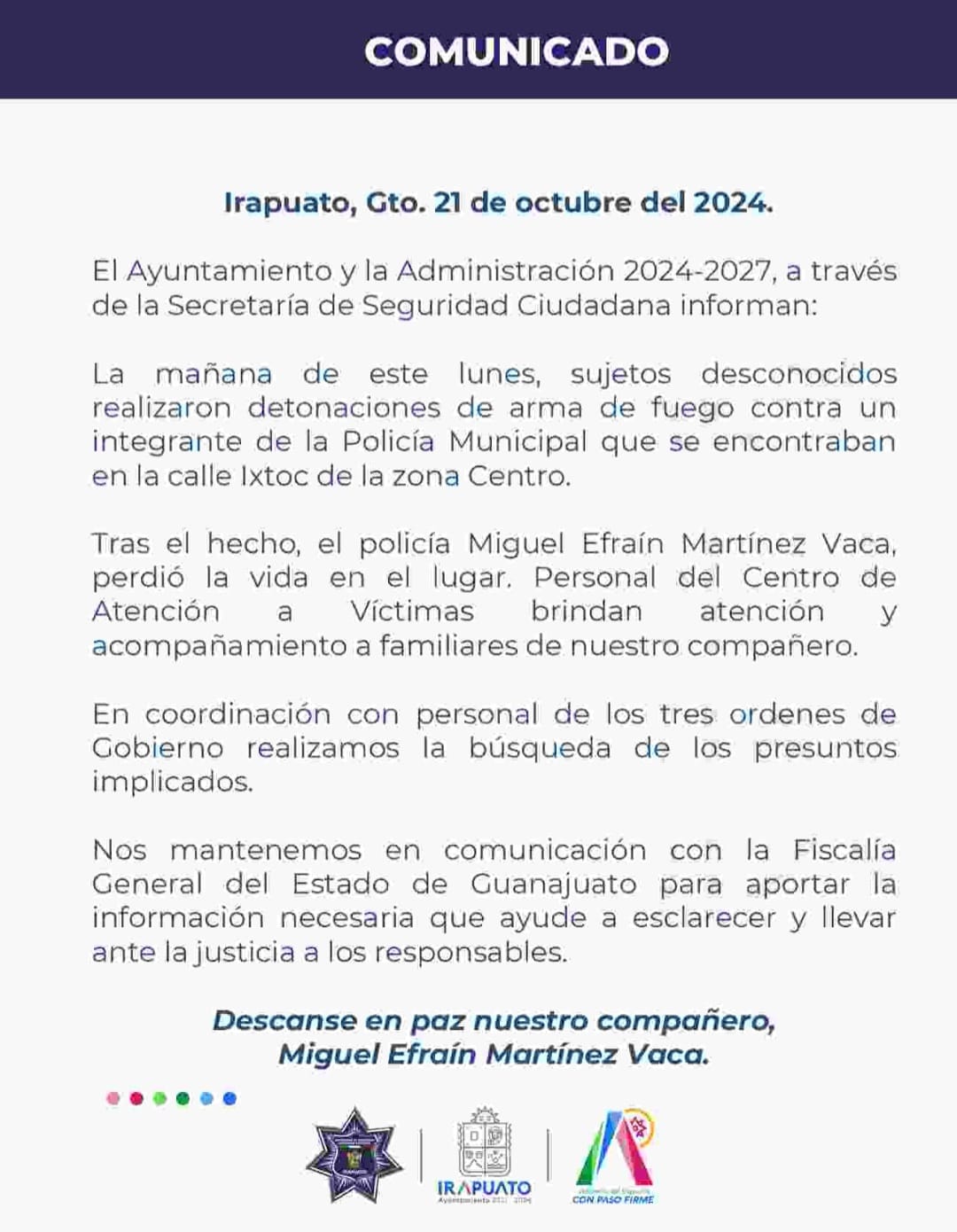 La Secretaría de Seguridad Ciudadana de Irapuato, confirmó el deceso y se mantienen en comunicación con la FGE para aportar la información necesaria que ayude a esclarecer y llevar ante la justicia a los responsables