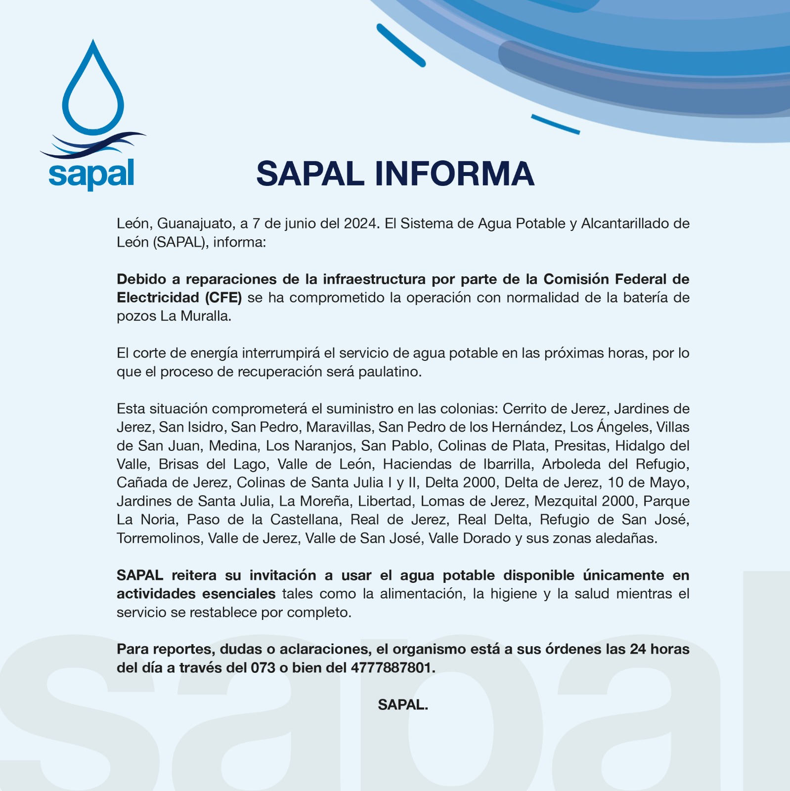 Más de treinta colonias de la ciudad, se verán afectadas en el suministro de agua.