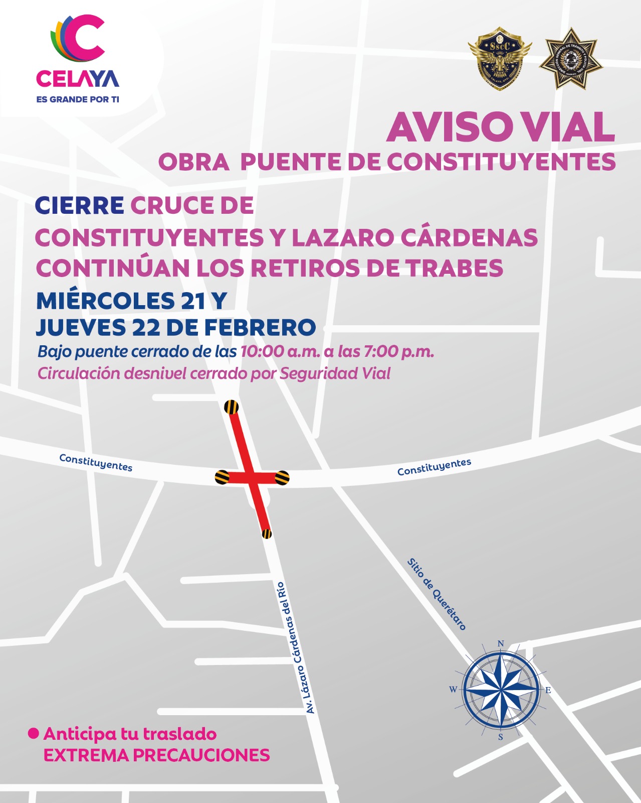 La Secretaría de Infraestructura, Conectividad y Movilidad (SICOM), informa que, para continuar con los trabajos de la segunda etapa del Distribuidor Vial Santa Fe, a partir de las 23:00 horas del día jueves 8 de julio y hasta el lunes 19 de julio, se cerrará el carril central en dirección a Juventino Rosas, a la altura de la Subsecretaría del Trabajo y Previsión Social.
