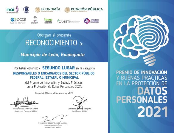 GANA MUNICIPIO DE LEÓN PREMIO POR EL TRABAJO “PROTECCIÓN DE DATOS PERSONALES EN LA ADMINISTRACIÓN PÚBLICA”